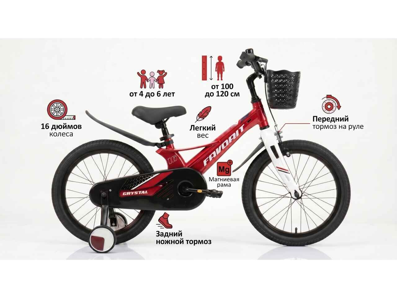 Хотите, чтобы ребёнок учился кататься на лёгком, понятном и максимально дружелюбном велосипеде? Favorit CRYSTAL 16 в ярком красном цвете — это отличный старт. Ножной тормоз — самый интуитивный способ остановки для маленьких ног, а магниевая рама не перегружает малыша. Идеальный выбор для первых самостоятельных поездок.