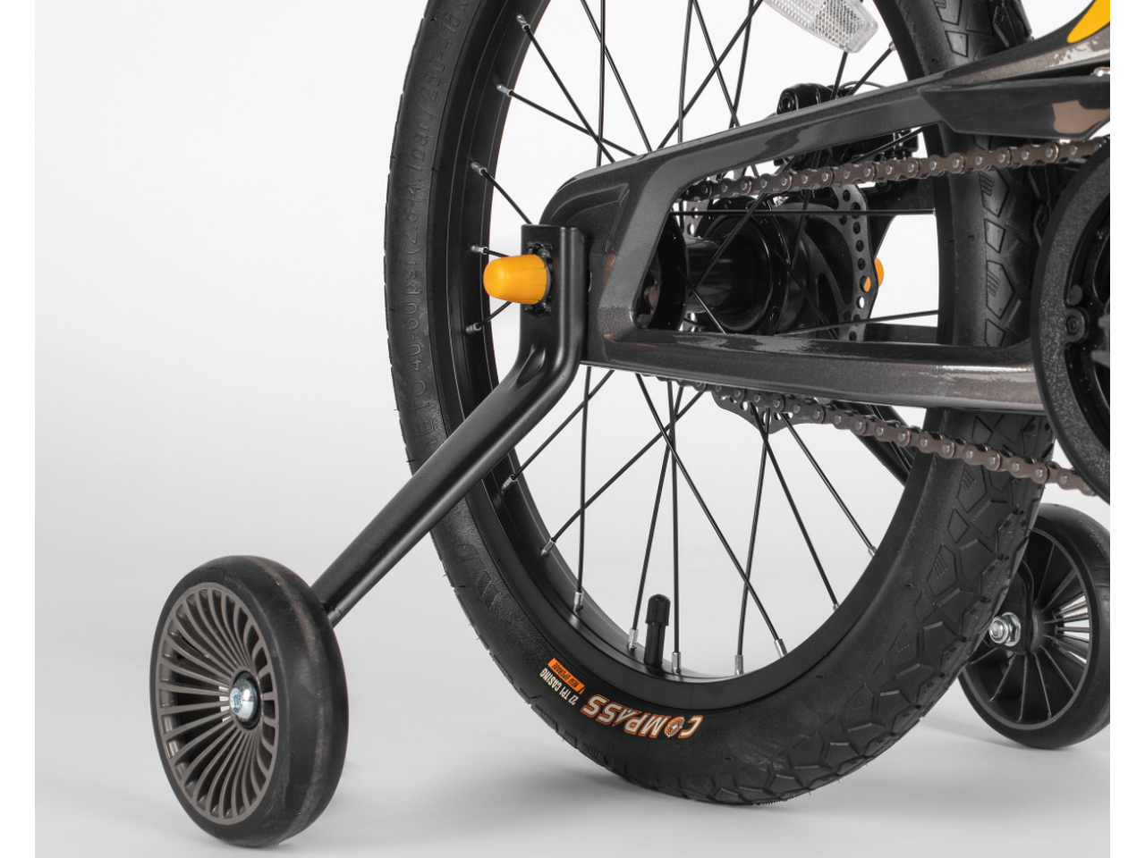 Как и в меньшей модели, здесь установлены дисковые механические тормоза и спереди, и сзади. Для более активного, быстрого и тяжелого ребенка этот тип тормозов критически важен. Они обеспечивают мощное, стабильное торможение на спусках и в любую погоду, давая уверенность как юному райдеру, так и его родителям.