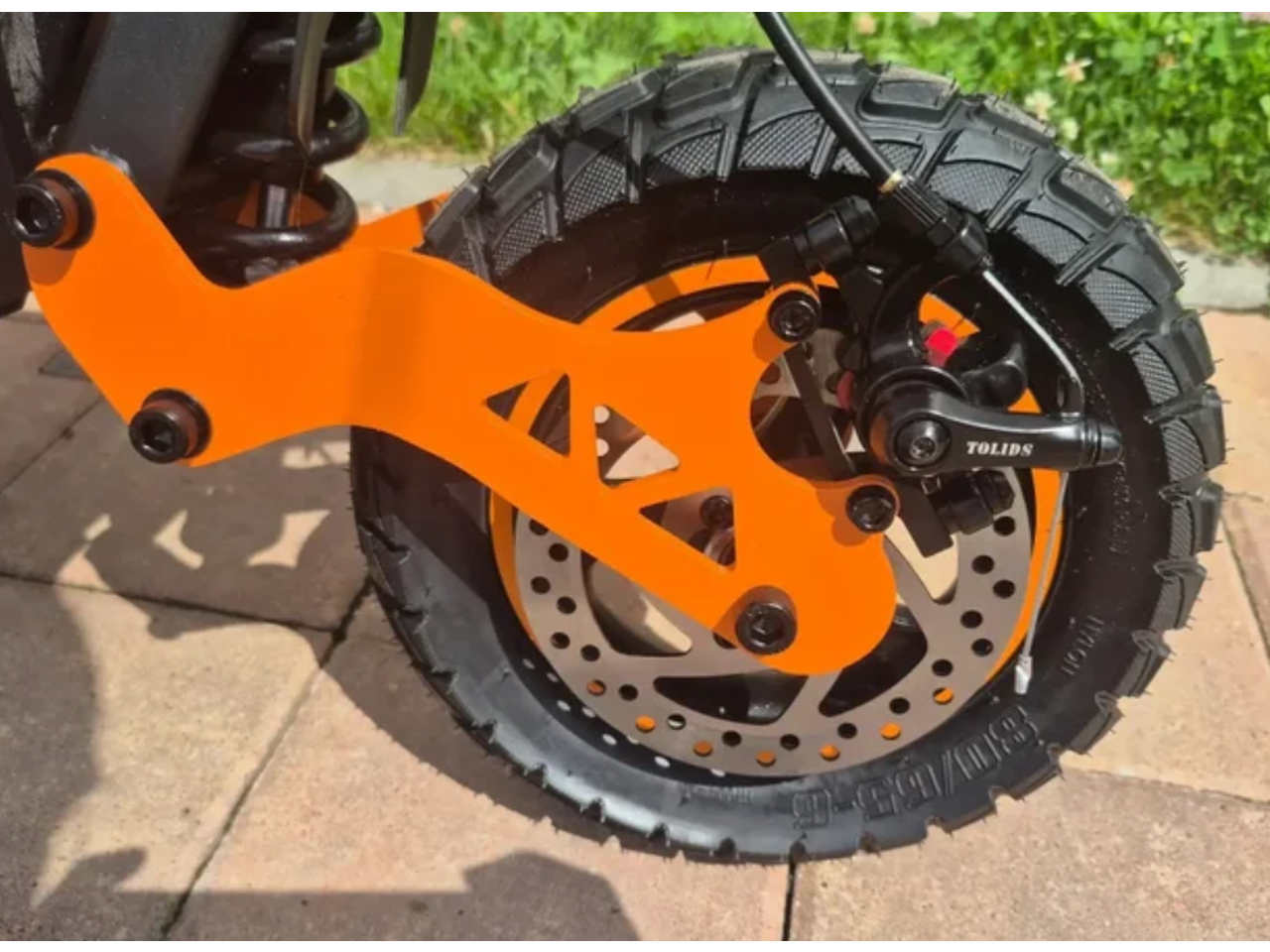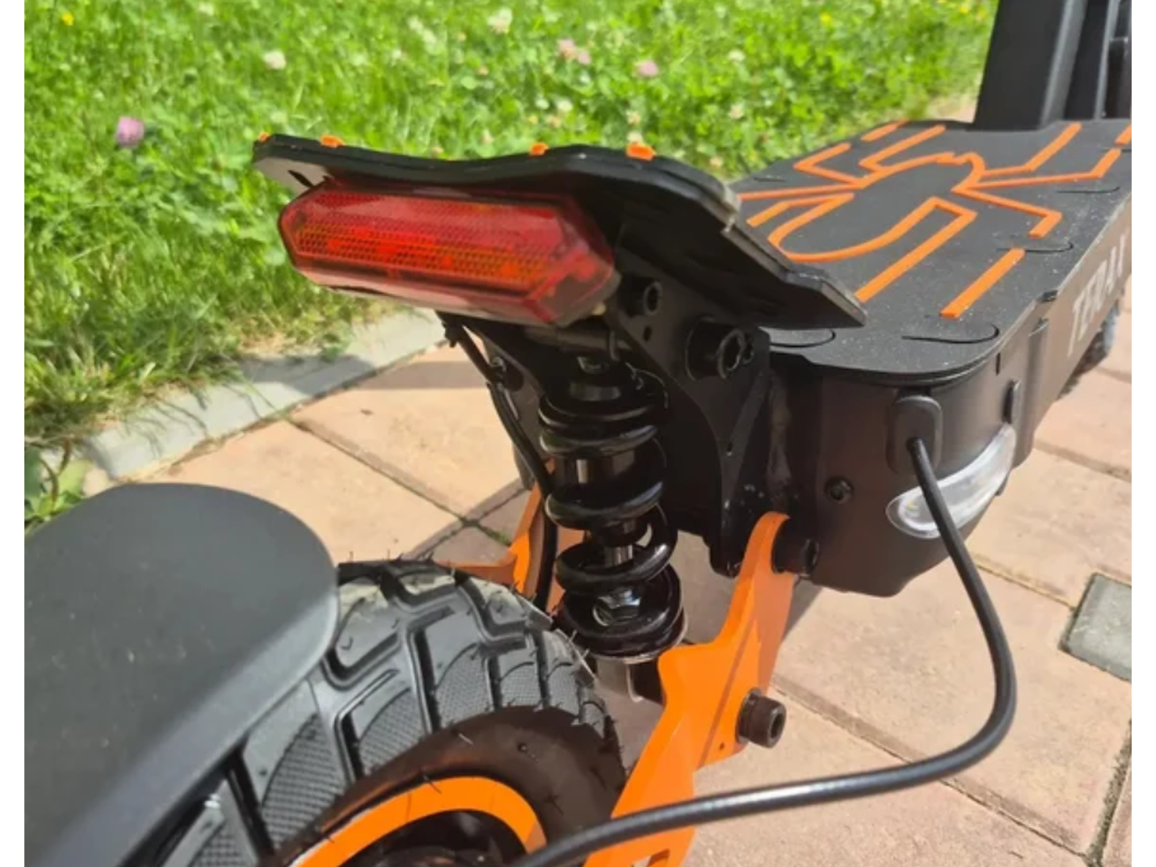 Тут есть всё для комфорта: удобное сиденье (не табуретка, а нормальное), амортизация, которая гасит ямы, и надувные колёса 10 дюймов. Сзади стоит дисковый механический тормоз — для такой мощности и веса самое оно. Останавливается чётко, без визга и намёков на отказ.